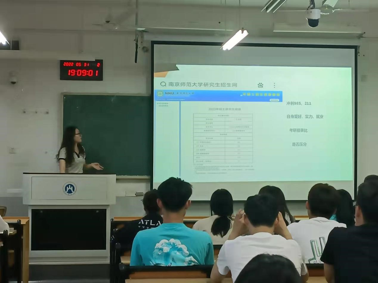 2018级体育经济与管理专业孔芳芳同学凭借自身努力,以总分376分,专业排名第二名的成绩考入南京师范大学。会上,她从自身考研经历出发,围绕着考研信息搜集与整合,进度流程计划,时间分配,专业课复习的方法与技巧等方面为我们详细讲解了备考期间的各个注意事项。