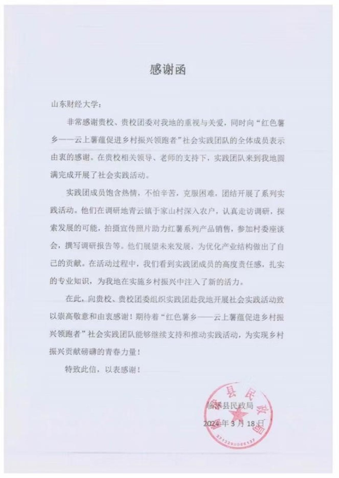近日,体育学院收到临沭县民政局发来的感谢信,信中对体育学院组织的“红色薯乡——云上薯蕴促进乡村振兴领跑者”社会实践团队致以诚挚的感谢,以表彰他们在当地乡村振兴、志愿服务等领域中所做出的积极贡献。此次实践调研活动不仅为当地乡村振兴带来了新鲜的视角和创新的思路,也进一步加深了大学生与乡村之间的紧密联系。