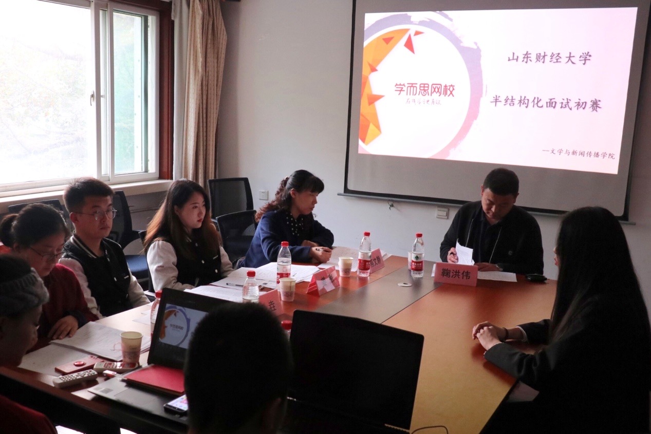 2019年11月8日下午两点,文学与新闻传播学院半结构化面试大赛初赛在舜耕校区干训楼举行。面试官由学而思网校老师姜彤、王垚、经济学院老师裴斐、数学与数量经济学院老师燕文静,文学与新闻传播学院老师鞠洪伟担任。