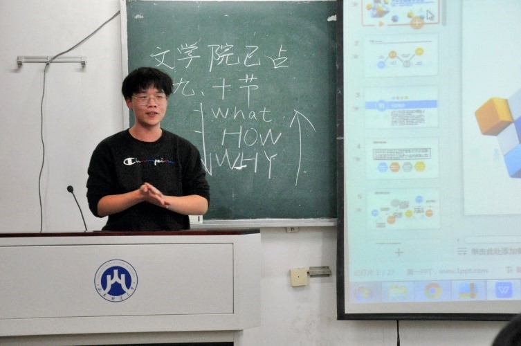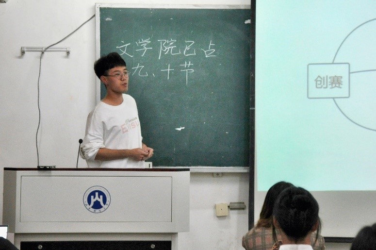 接着,19级文化产业管理二班李文政介绍了创新创业大赛的相关构成比赛,全面客观地分析了参加竞赛的利弊关系,最后通过具体的案例分析为同学们详细讲述了备赛过程,鼓励同学们积极报名,多多锻炼。