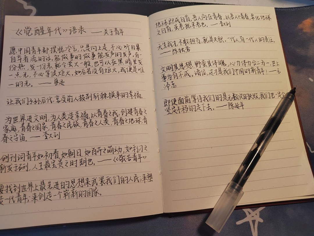 生而逢盛世,青年当有为。青年兴则国兴,青年强则国强。作为新时代青年要练就过硬本领,争做时代担当,敢于创新创造,实现青春理想,磨炼高尚品格,树立道德典范。愿中国青年都能摆脱冷气,只是向上走,不必听自暴自弃者流的话,能做事的做事,能发声的发声,有一份热,发一份光。只要青年人有力量,有理想,有担当,国家就有前途,民族就有希望。如此,安好!