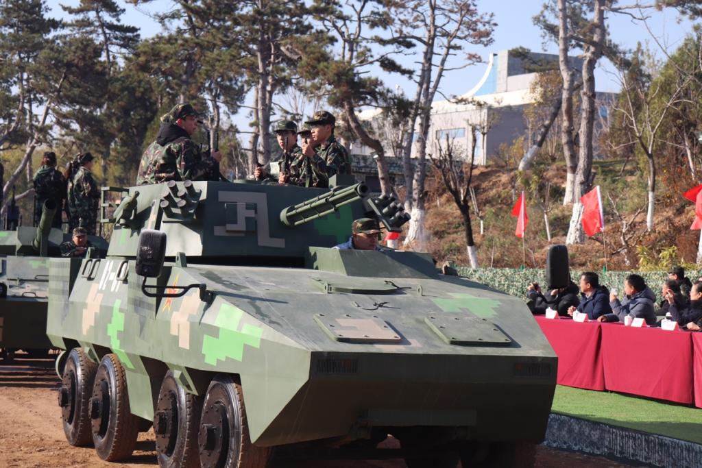 揭牌仪式结束后,董方军下达军事表演指令。在教官的指挥下,身着迷彩服、英姿飒爽的参训学生开展了队列动作、战术合成、模拟射击、战车演训四个表演项目。同学们不畏寒冷、斗志昂扬,展现出新时代大学生良好的精神面貌和军事素质。