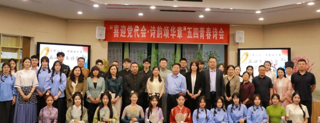 诗言青春志,青年勇担当。为迎接我校第二次党代会胜利召开,5月11日下午,由党委宣传部、校团委、文学与新闻传播学院主办的“喜迎党代会·诗韵颂华章”五四青春诗会在我校诗学研究中心成功举办。党委学生工作部部长杨哲、就业指导处处长刘奇耀,妇女工作委员会主任、工会副主席韩晓燕,文学与新闻传播学院党委书记杜啸尘、党委宣传部副部长张艳霞、管理科学与工程学院党委副书记吕晓燕、党委学生工作部副部长周广春、文学与新闻传播学院党委副书记王恩娟、保卫处副处长李雪明、文学与新闻传播学院副院长王丽霞,校报编辑段春娟、校团委李斌,济南市朗诵艺术家协会副主席、历下区朗诵艺术家协会主席、山东省演讲学会配音艺术专委会主任、我校2002级校友刘宗以及文学与新闻传播学院部分师生代表出席本次活动。活动现场座无虚席,气氛热烈,在这充满诗意的季节里,全体师生共赴一场诗词之约。