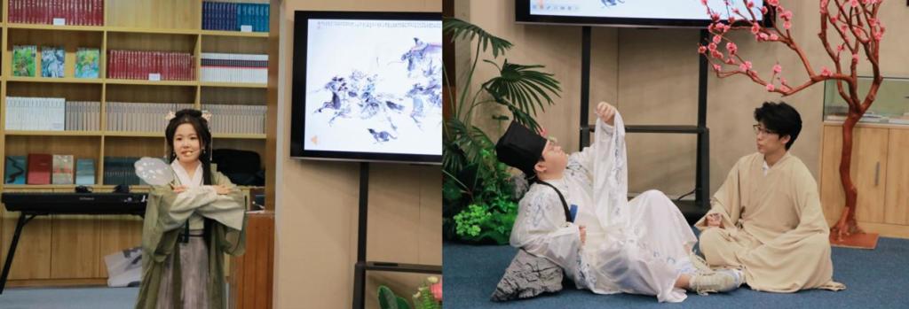 话剧《在天晴了的时候》,以《戴望舒诗集》为线索,讲述了地下党人用坚强的信念开辟崭新天地的感人故事;情景剧《遇易安》,带领观众回到千年前的宋代,感受易安居士李清照“兴尽晚回舟,误入藕花身处”的女儿情态和“至今思项羽,不肯过江东”的无尽豪迈;情景剧《聚星成火》演绎了闻一多先生诗歌《红烛》中的不屈精神,使同学们感受到了青春的力量和热血的温度,更加坚定了为新时代努力奋斗的理想目标。