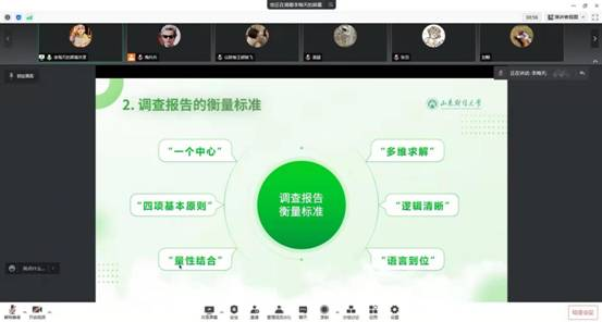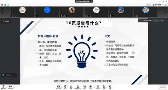 两位分享人结合自己的参赛经历,从确定主题、实践调研、报告撰写以及视频录制等方面为同学们深入分析了竞赛各项要求和注意事项。葛颖同学重点分享了调研报告的基本结构和具体内容,向同学们阐述了如何利用短小的报告抓住评委的眼球。她提出报告的前三页是重中之重,题目要与大赛主题和内容贴合,正文部分要体现项目的调研过程,将行业前沿的技术融合到实施路径中。在提出现存问题后,需要对应提出有新意、抓痛点的建议。在分享过程中还从排版、错别字、图片与表格三个方面着重强调了“坚决不能有的错误”。李海天同学结合当下社会热点,为同学们的选题提供了一些方向。她将调研报告的衡量标准分为一个中心、四个基本原则、量性结合、多维求解、逻辑清晰、语言到位六个方面分析讲解,并详细介绍了调研报告的“沙漏原则”,建议大家写调研报告时先集中到专门化的领域,再专业性分析到普通领域。两位分享人强调了自信心对比赛的重要性,希望同学们在竞赛中能够始终保有信心,放平心态,注重团队协调配合,以期收获圆满的成绩。