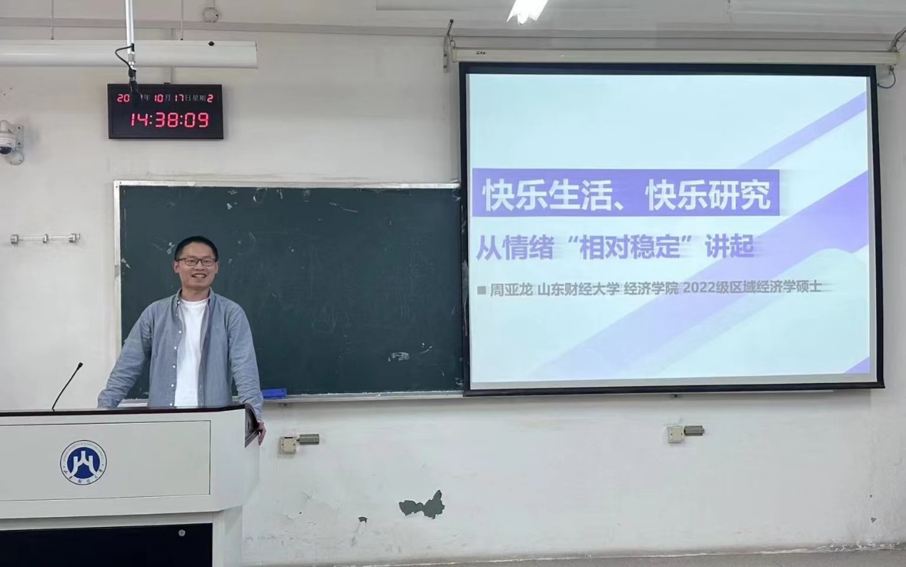周亚龙在情绪管理方面分享了自己的感悟。关于保持情绪“相对稳定”他向同学们提出三点建议:一是希望同学们快速进入研究生状态,处理好工作与生活的关系,以及与室友、导师的关系;二是做到努力不抱怨,尽量少抱怨;三是学会适度思考,在减少内耗的同时注意自身情绪对他人的影响