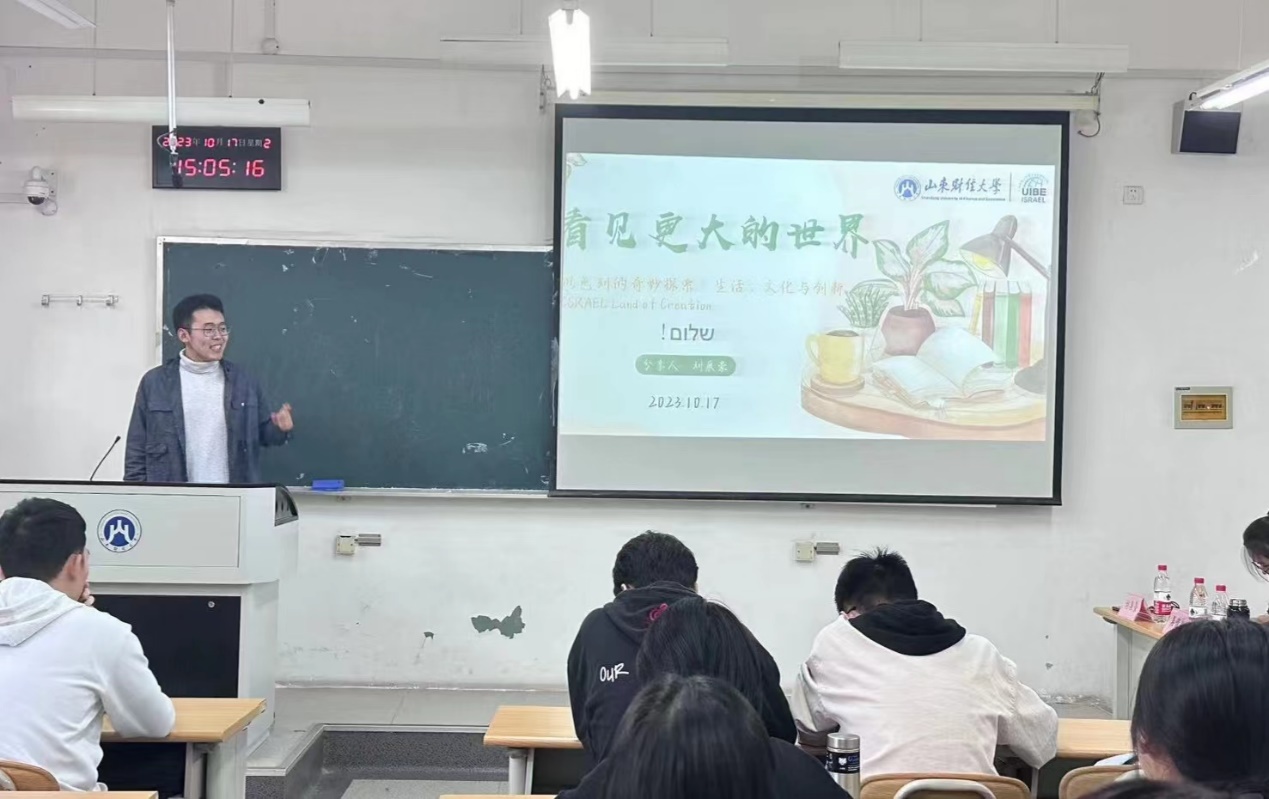 刘展豪以“看见更大的世界”为主题,与同学们分享了他在外经贸大学以色列分校的访学和生活经历。访学共包含批判性与创造性思维、以色列文化概论、希伯来语、管理经济学与组织行为学等五门课程,拓宽了学术视野,提升了学术能力。同时,他 还向同学们介绍了以色列这个国家的基本概况以及其多元化、包容性和创新性等特点。他深入探讨了以色列创新力的来源,并分享了自己对巴以冲突时事热点的见解。刘展豪告诉同学们,访学有助于拓宽视野,感受文化的碰撞与交融,为生活与科研提供全新的思考角度。
