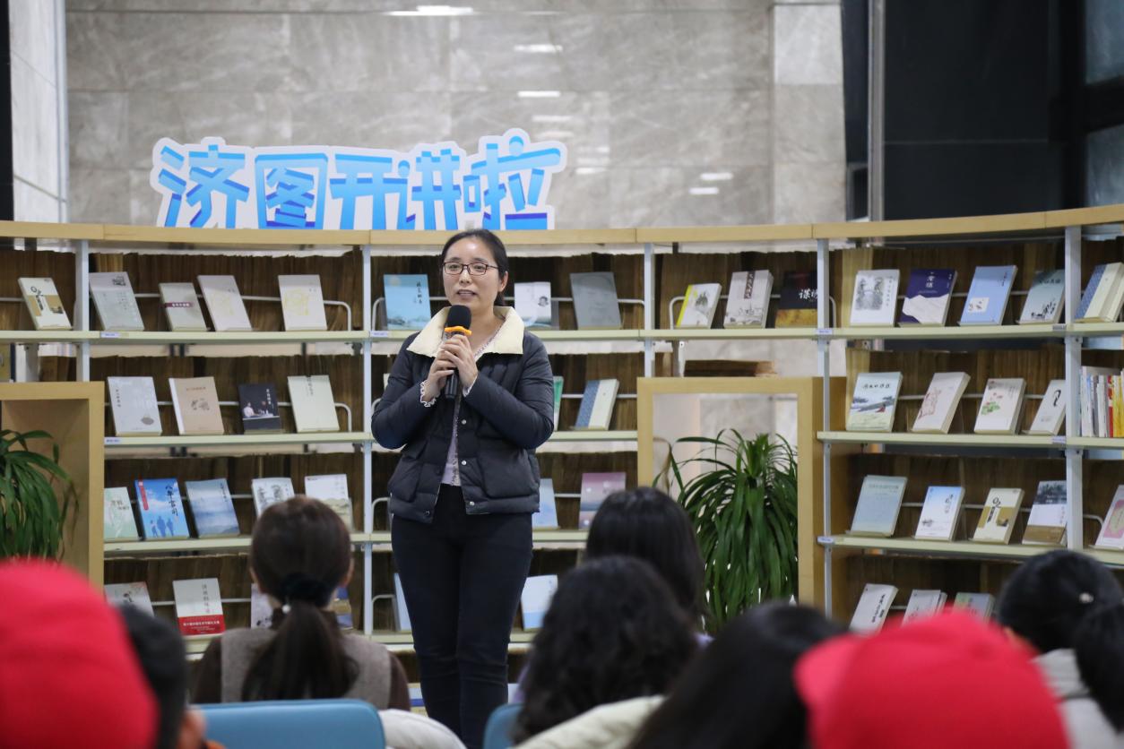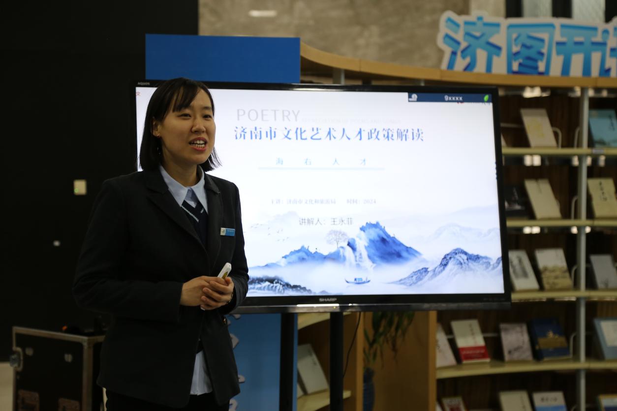 市文旅局“海右人才”政策宣讲团宣讲员、济南市图书馆团支部书记王永菲为大学生讲解《济南市人才政策“双30条”(2024版)》,重点宣讲济南市文化艺术人才政策,帮助在场大学生了解济南市人才政策措施,促使他们创业济南、扎根济南、圆梦济南。