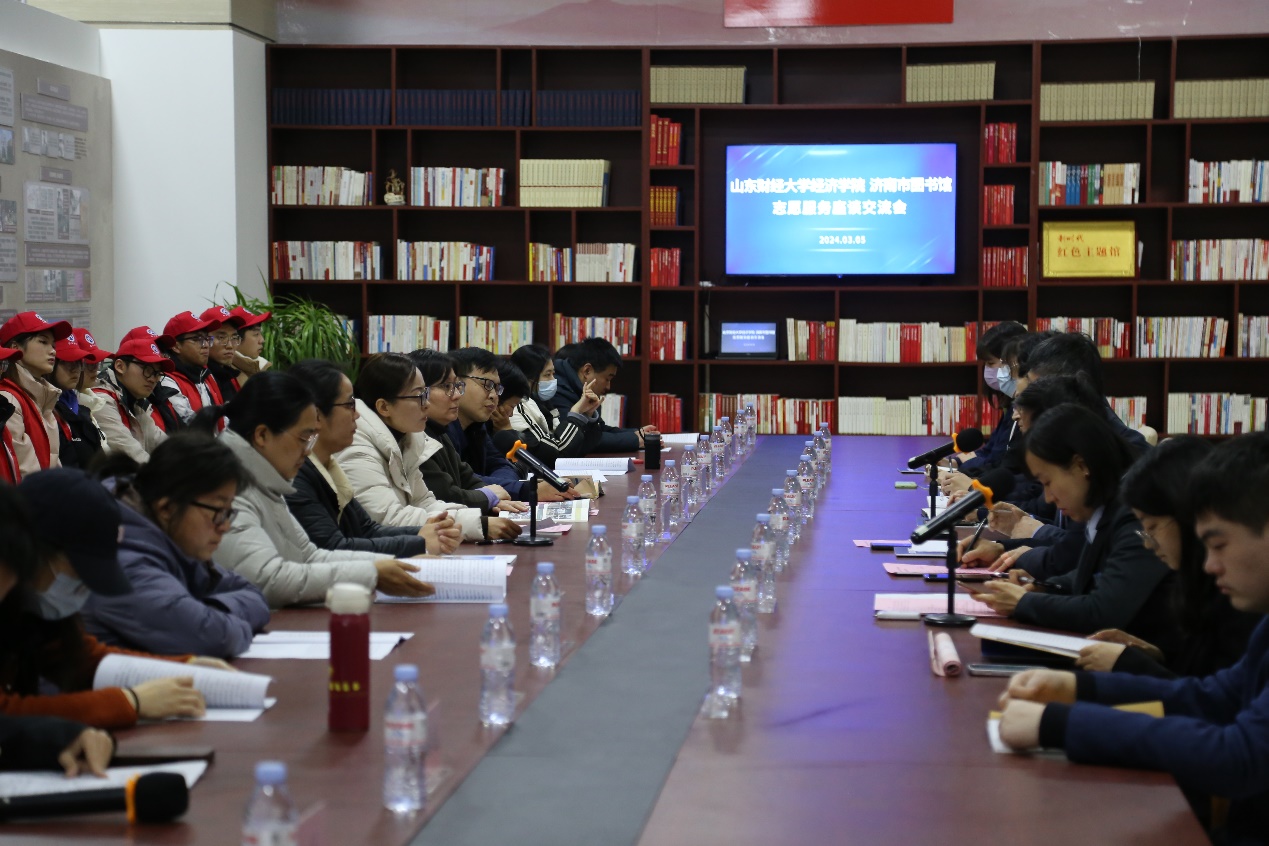 李冰封对济南市图书馆为经济学院师生及青年志愿者提供的实践机会表示感谢,对市图近年来的发展给予高度评价,并对我校及经济学院的发展历史、学科建设、教学科研、党团建设、社会实践和志愿服务、创新创业作详细介绍。她指出,高校和图书馆共同承担着知识传播、文化弘扬的职责,担负着立德育人、陶冶情操的使命,高校和图书馆仿佛一对“孪生姊妹”,是帮助大学生确立文化自信,强化价值引领的重要平台。经济学院将和市图共同夯实文化育人的思想基础,营造勤学善思的学习氛围,拓展志愿服务的实践载体,拓宽交流合作的方式渠道,增进互通互促,助力共同发展。