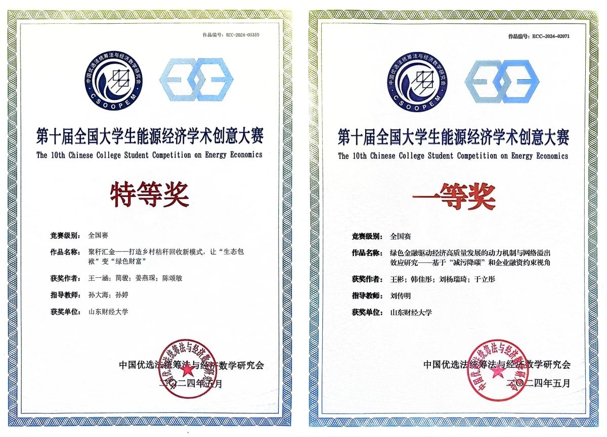 由公共管理学院教师孙大海和经济学院教师孙婷共同指导,经济学院2021级本科生王一涵为项目负责人的《聚秆汇金——打造乡村秸秆回收新模式,让“生态包袱”变“绿色财富”》团队获得特等奖。由经济学院教师刘传明指导,财政税务学院2021级本科生王彬为项目负责人的《绿色金融驱动经济高质量发展的动力机制与网络溢出效应研究——基于“减污降碳”和企业融资约束视角》团队获得一等奖。