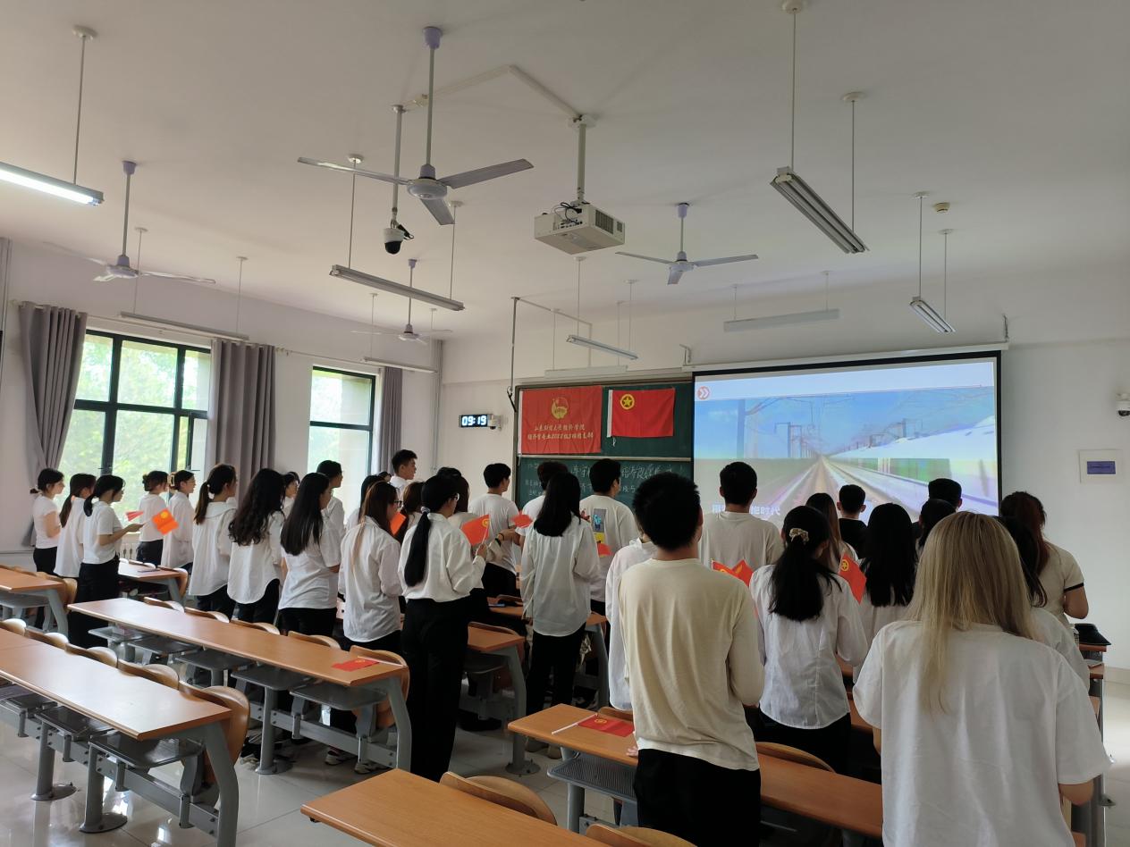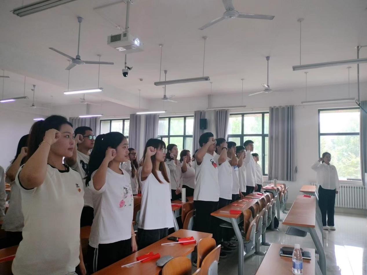 田俊姿带领团员们学习《中国共产主义青年团章程》,号召团员青年认真学团章、习团史、知团情,充分了解掌握团务知识与内容,深刻认识共青团的性质、宗旨、指导思想、根本任务以及团旗团徽等内容,进一步加深广大团员对共青团的认识,密切与共青团组织的密切联系,加深对共青团的感情;“青年之声”主题分享环节,团员青年代表赵童辉、李依诺分享本次主题团日活动的感悟体会;田俊姿带领支部全体团员重温入团誓词、合唱团歌,同学们挥舞着团旗,激情饱满,慷慨激昂,展现出“爱团如家,初心不忘”的青春热爱。