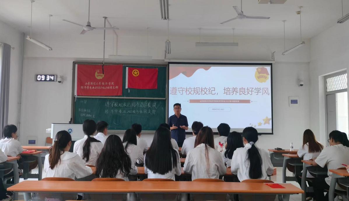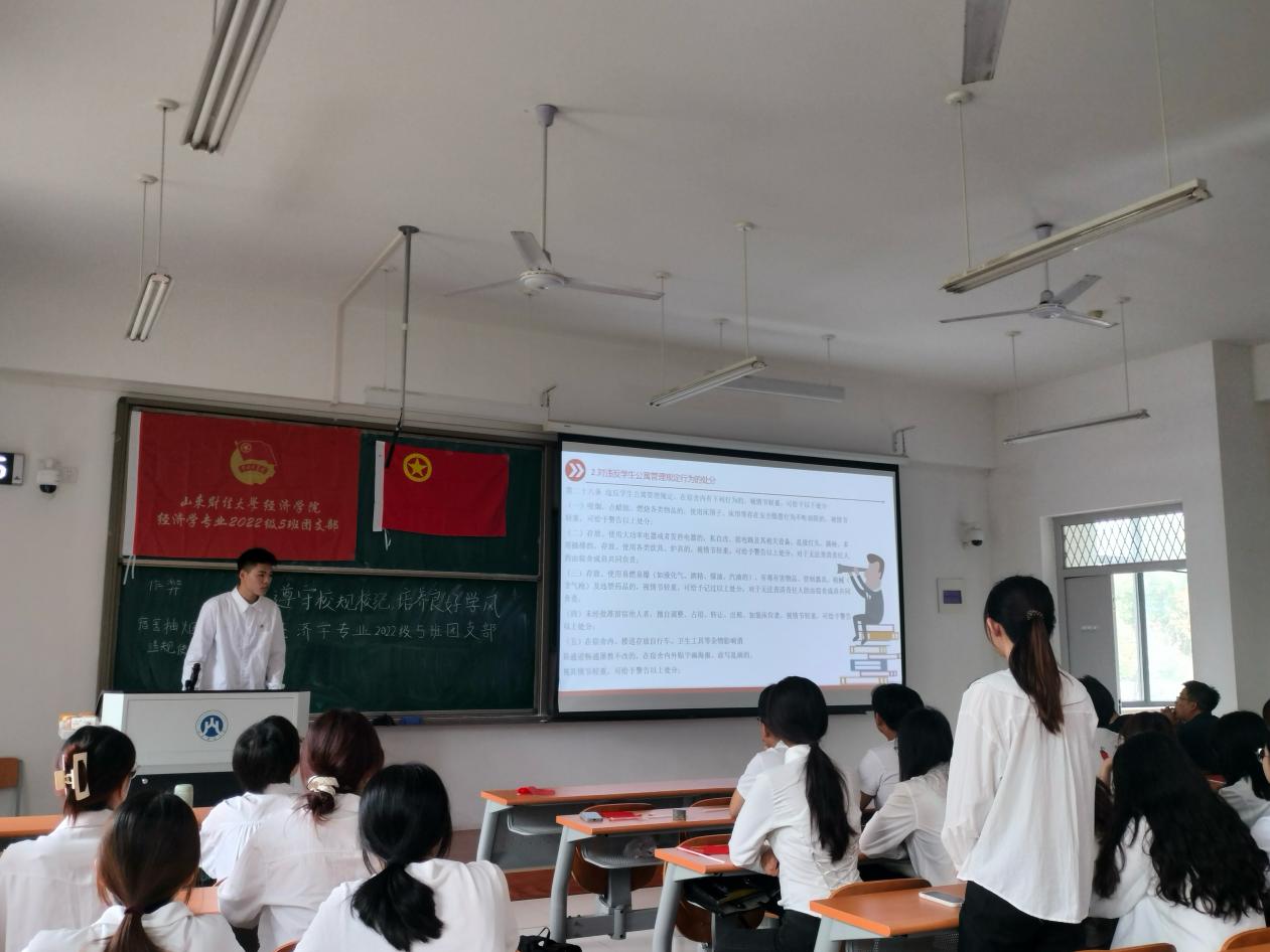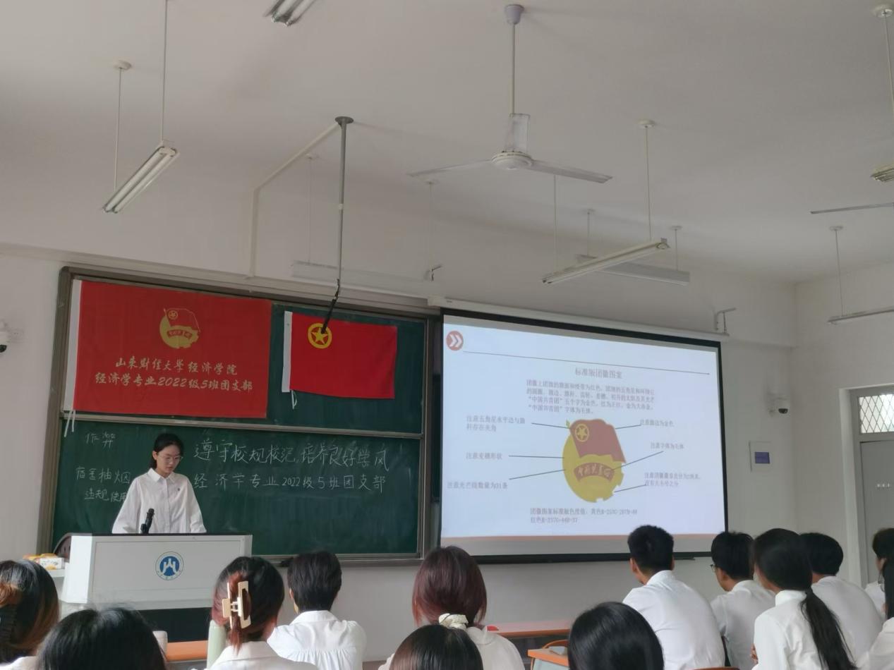 经济学专业2022级5班团支部主题团日5月24日上午在圣井校区7号教学楼举行,包括“知纪明纪守纪 共创优良学风”、“认真学习团章 青春筑梦未来”、“‘青年之声’主题分享”、“重温入团誓词”“共唱团歌”五个环节。副团支书、班长康熙以“击鼓传花”的方式与支部团员互动,总结校园中常见的违规违纪现象和行为,并剖析这些行为违反的条例内容,以及带来的深层次的恶劣影响和后果;他带领支部团员学习《山东财经大学学生手册》,结合目前青年学生在学习、生活、纪律、卫生等方面存在的问题,重点解读《山东财经大学违纪处分条例》《山东财经大学学生公寓管理条例》等内容,让团员青年们对校规校纪有了更加清晰深入的认识理解。