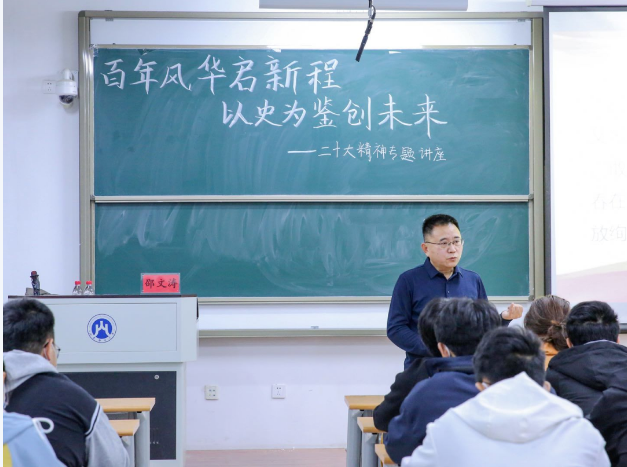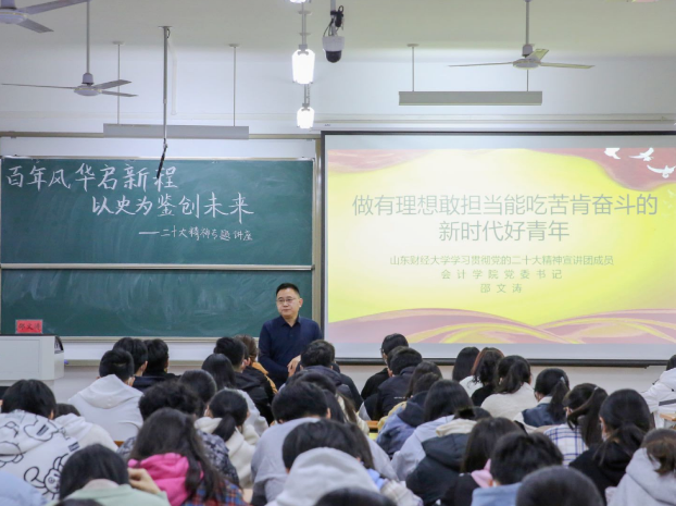 为深入学习宣传贯彻党的二十大精神,把思想统一到党的二十大精神上来,把力量凝聚到党的二十大确定的各项任务上来,引领青年学子坚定不移听党话、跟党走,引导学子们把握历史规律、认清世界形势、融入发展大势,塑造青年学生怀抱梦想又脚踏实地,敢想敢为又善作善成,努力成为堪当民族复兴重任的时代新人,11月15日19:00,会计学院党委书记邵文涛在圣井校区6218教室为学生们开展“百年风华启新程,以史为鉴创未来”二十大精神专题讲座。