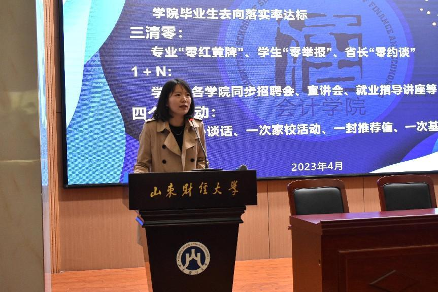 会计学院就业办主任孙菁结合学校、会计学院2023年就业工作要点及会计学院工作落实具体要求进行了汇报,她表示,当前正值毕业生春招季,要抢抓春招关键期,全力攻坚促就业,工作开展重点围绕“一拓、二进、三招、四主题”有序推进就业育人工作。会计学院将通过加强校内外资源的联动、发动全体教师共同参与、开展系列就业教育活动等方面落实就业工作,争取实现毕业生充分且高质量就业。