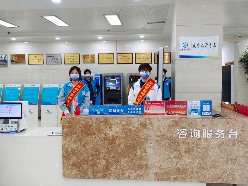 阳光正好,风和日丽。计算机学院的志愿者们来到历下区政务服务大厅,在工作人员的简单培训和讲解下,志愿者们两两一组,走上“雷锋岗”,开展志愿服务工作,包括大厅各窗口咨询服务、预约取号、业务引导等,帮助办事群众和企业进行网上取号、表格填写、手机注册和线上业务办理、文件上传及打印等网办服务,发挥专业优势,促进了大厅数字化、智能化办公,提高了业务办理效率,减少了群众跑动的频率,获得了社区、大厅工作人员和群众的一致好评。