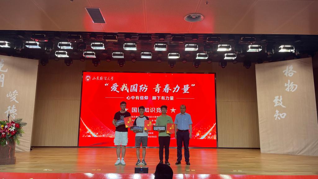本次国防知识竞赛设置必答题、抢答题、抢分题三个比赛环节,比赛前期,参赛队员熟练掌握《国家安全与国防教育知识竞赛题库》及《山东财经大学大学生入伍60问》;比赛现场,队员分工明确,临危不乱,伴随着现场观众一阵阵热烈掌声,最终在决赛的六支队伍中脱颖而出,以领先第二名超过一百分的巨大优势夺得冠军。