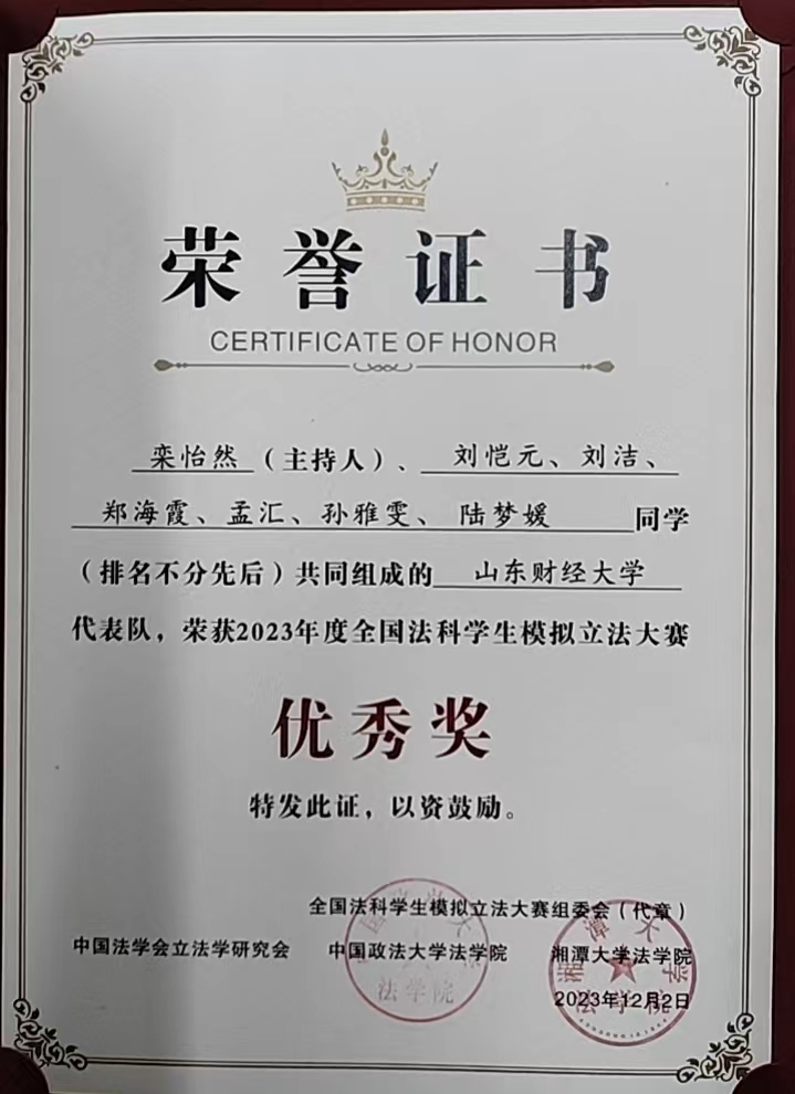 2023年11月20日由中国法学会立法学研究会主办,中国政法大学法学院、湘潭大学法学院承办的2023年度全国法科学生模拟立法大赛成绩公布,由刘奇耀老师指导,2022级涉外经贸法律人才实验班栾怡然同学作为负责人的作品《生成式人工智能服务管理规定(草案)》荣获2023年度全国法科学生模拟立法大赛优秀奖。