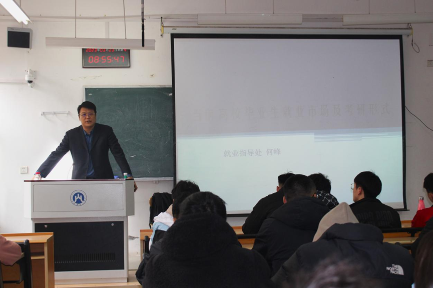 何峰从近期国家发布的就业、考研相关重要数据入手,直观展现了当前就业市场形势和考研形势。他结合自身长期实践所积累的工作经验分别从就业形势、就业政策、就业观念等方面为同学们做了详细的讲解与分析。他介绍了经济发展状况和企业生存现状对当前高校毕业生的就业影响,针对当前就业形势为学生分享求职技巧,提出就业建议,倡导学生要理性看待考研,切勿盲目跟风备战考研。他希望同学们能够合理规划,从思想上提高认识,树立正确的择业观就业观,要立志服务社会。互动环节,同学们积极发言和提问,讲座现场气氛非常活跃。会后同学们表示收获颇多,受益匪浅,并决心以此讲座为起点,以更加积极的心态、理性的认识对待就业和择业。