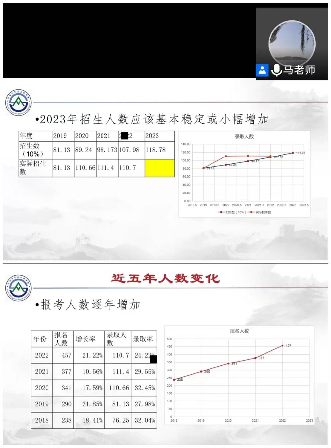会上,马建华从全国报考情况、学院报考情况、学院招生情况、2023年趋势分析四个方面展开了详细地讲解。马建华从疫情等各方面原因分析了近五年研究生考试的情况,对比了学院报考率和全国研究生报考率,给出了2022年本科生考研录取人数以及考入院校,着重介绍了各个专业的招生计划和考试科目,同时从工学和管理学两个方面详细分析了2023年报考趋势。在互动环节中,同学们踊跃提出自己在考研方面的疑惑,马院长耐心地回答了每个同学的问题并给出针对性的建议,帮助同学们明确方向。