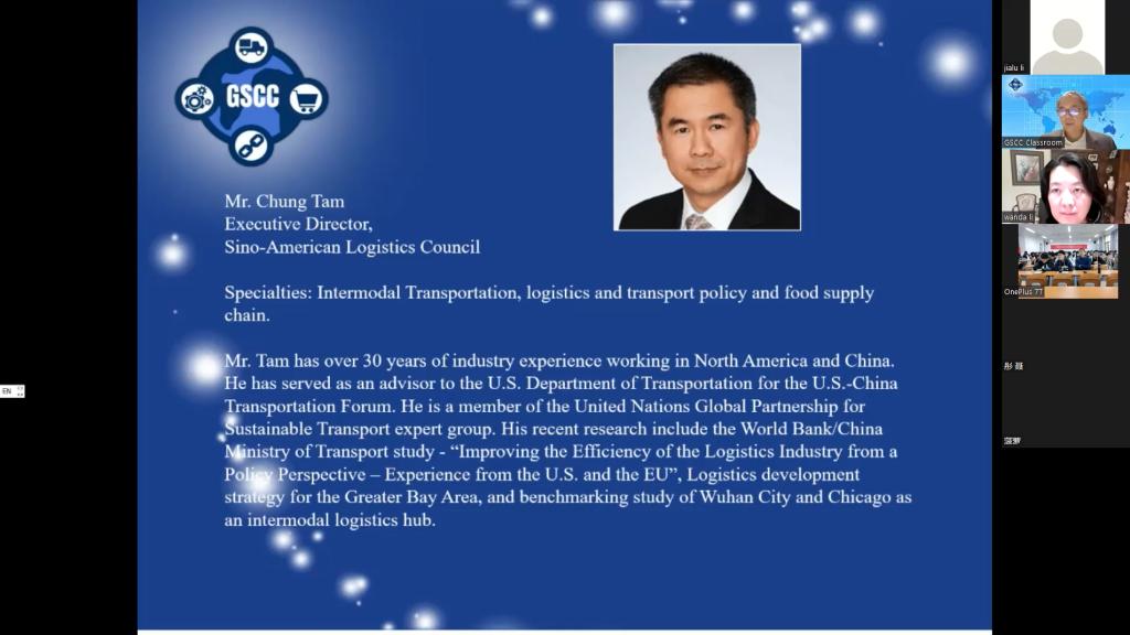 Tam董事首先对全球供应链课堂(GSCC)所涉及的供应链课程进行简要介绍,并借此引入了成为国际化供应链物流行业人才所需要具备的要素。他通过介绍亚太、北美等知识模块,凸显亚洲经济状况及其所包含国家的特点与优势从而论证亚太地区具有强劲的增长潜力,并对亚太地区物流产业未来的发展趋势提出自己的见解,对企业应注意的方面给出了自己的建议。Ozpolat教授从无人机配送、3D打印、新能源自动驾驶卡车等高科技设备以及当前国际局势等层面分析供应链发展新趋势并结合自身曾任联合国物流系统分析师的经历,分享了有关人道主义物流的案例与项目。Hales教授从供应链所包含的要素入手,穿插分析麦当劳的案例,讲述了供应链的重要性以及供应链所具有的战略功能。此外他还对比各国物流发展形势帮助与会者了解物流行业在世界范围内的发展态势。