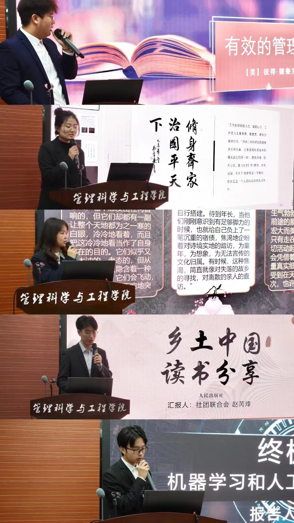 五位学生干部相继分享了已读的书籍以及个人感悟。综合部常子尧分享的是美国管理学家彼得·德鲁克的《有效的管理者》,他结合自己提出的三个问题,根据作者生平与作品内容,总结得出了关于“管理”的感悟。学术部殷佳锐介绍的《终极算法—机器学习和人工智能如何重塑世界》一书揭示了算法的本质和算法对当今社会的重要性。 社会实践部的黄雪雯分享了《文化苦旅》并指出此书为心之所至、行之以往、齐心涤虑,能够从中得到深刻领悟。社团联合会的赵芮烽带来了《乡土中国》一书,他以“乡土本色”、“文字下乡”、“从欲望到需要”三个主题介绍了此书内容,并总结了社会变化。来自文体部的田宇分享的书籍为稻盛和夫的《干法》,她通过提出“为什么要工作”进而引出“如何投入工作”,并进一步阐述了“怎样出色工作”,从而鼓励大家积极生活。最后,何丽老师强调了读书的意义,并鼓励同学们要养成阅读的习惯,做好学业生涯规划,在学院营造良好的学习氛围。