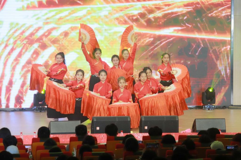 本场晚会分为“新光璀璨同赴约”、“追光而遇展风华”、“沐光而行共逐梦”三个篇章,在绸扇舞《象王行》中拉开序幕,学院艺术团舞蹈部的女生们手握红扇,身着红装,以刚劲有力的舞步舞出了青春的活力,点燃了全场的热情。