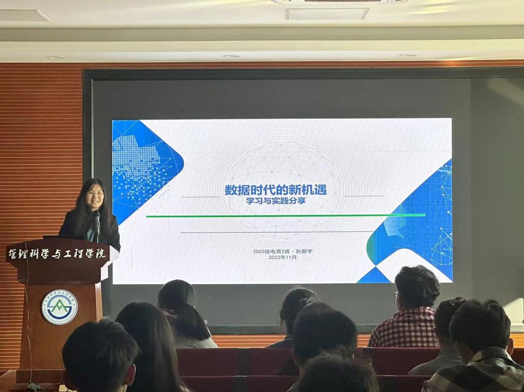 11月21日下午,管理科学与工程学院特邀北京宝石花医学研究院有限公司副总经理、山东鸿联维度数字科技有限公司联合创始人、电子商务专业2003级优秀校友孙新宇,在圣井校区6432报告厅为在校生们做了一次主题为“数据时代的新机遇——学习与实践分享”的专题讲座。本次讲座由王桂月老师主持,我院2022、2023级部分学生参加。