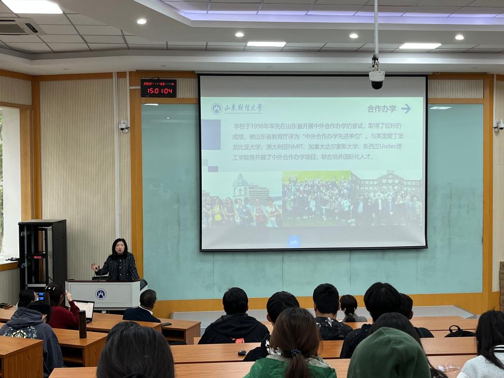 马晓倩首先为同学们进行了大学学业规划方面的分享,并详细介绍了留学项目学校的概况,让同学们对国外合作院校的历史、相关专业及排名认证有了更加清晰的认识和了解。她强调,学校于2018年11月正式申请成为教育部“平安留学”行前培训协办单位,2022年10月,学校正式启动AACSB认证工作,近年来学校加大引进海外高层次人才力度,重点聘请外籍专家承担我校教学和科研任务,同时招收来华留学生。