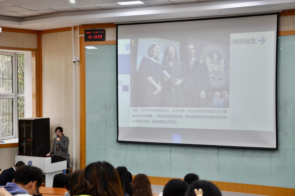 宋晓向同学们介绍了王舸,宋佳鸿,赵丹宁等参加留学项目的优秀毕业生事迹,并对同学们的大学学业规划进行了具体介绍。她提到,一些与国内研究生不同的硕士项目可以节省准备考试的时间和精力,例如国际硕士项目,港、澳硕士项目和中外合作办学硕士项目等。与国内考研的不同之处在于,这些项目对于文凭、学制、申请/录取程序、语言水平有所要求。宋晓老师为同学们未来的学业规划提出了实质性建议,为大家指明方向。
