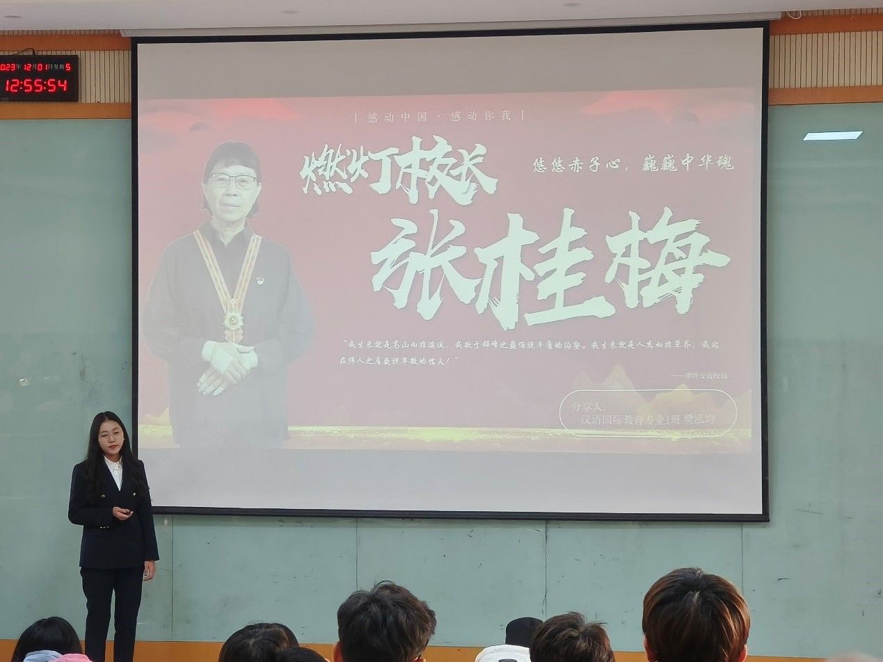 樊泓均以“悠悠赤子心,燃灯中华魂”为题,讲述张桂梅校长将对党的忠诚与对人民的热爱融进办学体系,用实际行动为数千名山区女孩铺就用知识改变命运的圆梦之路的先进事迹,歌颂了她无私奉献、潜心育人的燃灯精神与立德树人的使命担当。