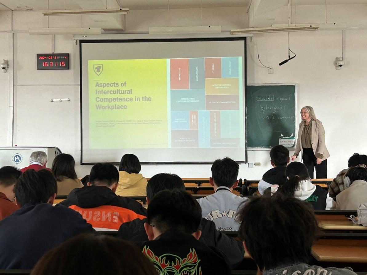 3月14日、21日下午,国际教育学院邀请Jennifer J. MacDonald博士在舜耕校区1106、2501教室举办系列讲座。Jennifer为国际教育学院师生分别作了题为“Technology in language education”“Ten ways international study can advance your learning and future career”的报告。讲座围绕技术赋能教学及学生留学与发展两大主题,引导教师和学生思考如何将智慧技术与语言教学进行结合,为学生专业学习及个人发展提供系列建议,报告现场气氛热烈。