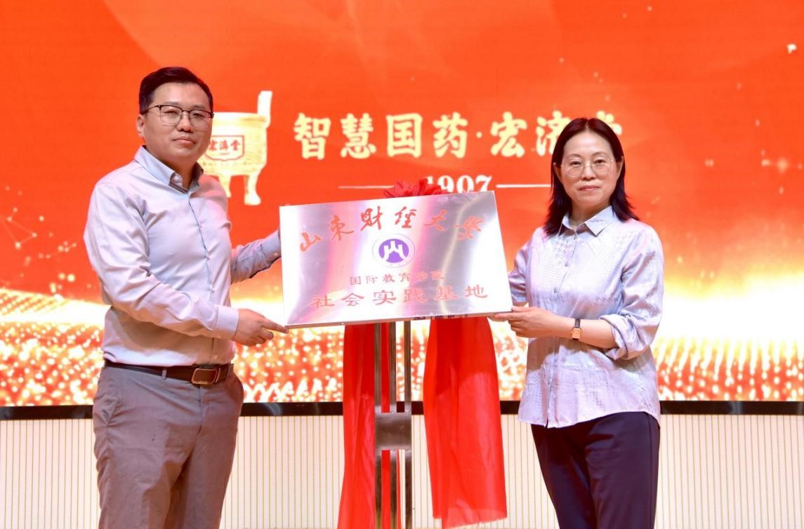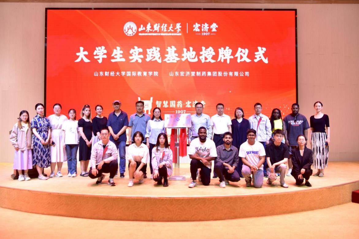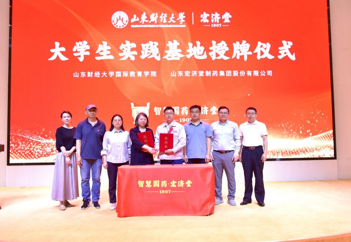 参观结束后,师生们齐聚一堂,共同见证国际教育学院与宏济堂制药集团签订协议,揭牌建立大学生社会实践基地。宏济堂制药集团国际贸易部总监顾若炜、国际教育学院党委书记张红燕、留学生专业课教师王骥洲相继致辞。