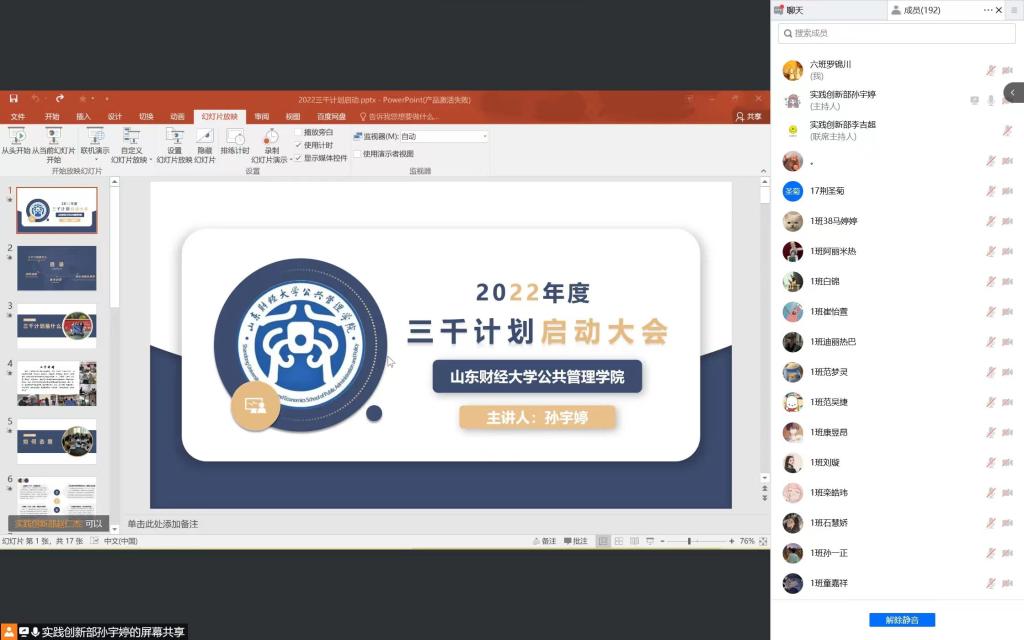行是知之始,知是行之成。4月14日晚,公共管理学院实践创新部通过腾讯会议成功举办“公共管理学院三千计划启动大会”,本次会议由实践创新部部长孙宇婷、副部李吉超同学主讲,全体2021级同学参加。