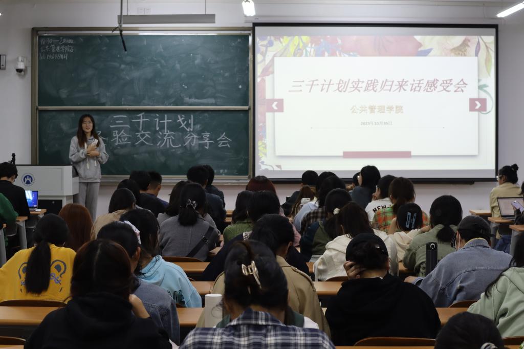为了让公共管理学院新生更好地了解“三千计划”社会实践活动,提升社会实践调研与撰写报告经验,10月30日晚,公共管理学院于圣井校区8-112教室召开了“三千计划”经验交流分享会。此次活动由公共管理学院实践创新部组织,三支重大团队分享,2023级全体同学参加。
