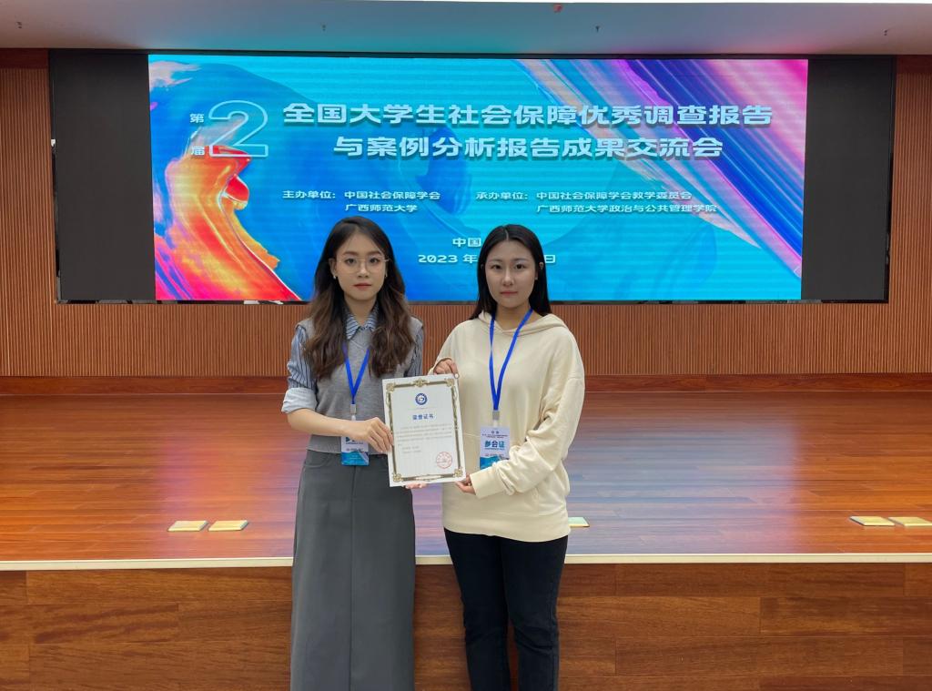 12月9日上午,由中国社会保障学会教学委员会和广西师范大学政治与公共管理学院承办的第二届“全国大学生社会保障优秀调查报告与案例分析报告”成果交流会在广西桂林举行。本届征集活动共收到了来自全国40多所高校共计200余份参赛作品。经中国社会保障学会专家匿名评审,最终产生了23份优秀调查报告和15份优秀案例分析报告。公共管理学院2021级行政管理专业本科生焦凤博作为负责人完成的《打通医养结合的“最后一公里”:养老机构医养结合实施现状及模式创新研究——基于17家医养结合型养老机构的调研》,被评选为社会保障优秀调查报告。指导老师贾海彦、许薇携2021级本科生焦凤博与2022级研究生郭紫曦赴桂林参加成果交流会。