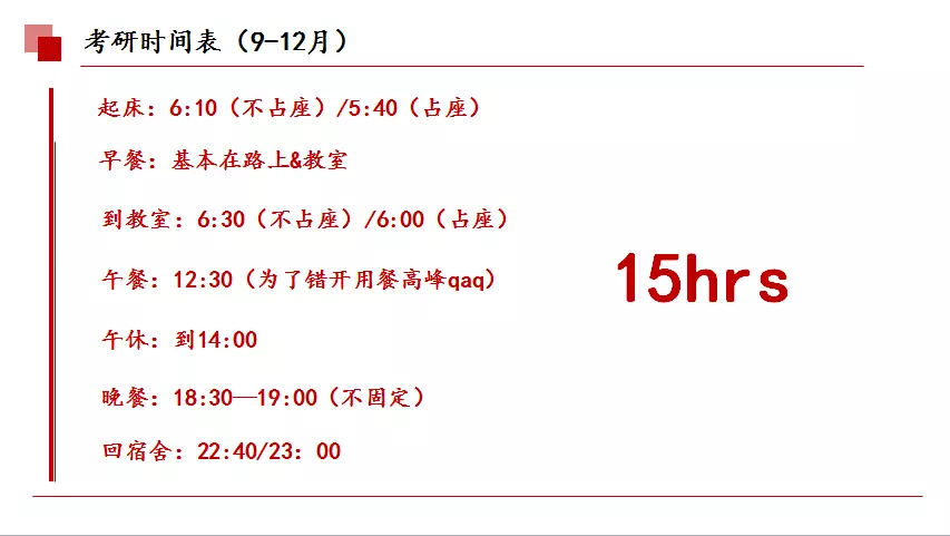 李一宁正式开始准备考研是在去年的三月份左右。这个时间也是她建议备考的同学们开始进行考研准备的时间,因为如果准备的时间线过长,可能到最后会坚持不下去,对考研是非常不利的。九到十二月份是非常重要的冲刺阶段。她建议大家在这个阶段坚持进行锻炼,以保持充分的精力学习。她希望学弟学妹们能够提前考虑好专业和学校,并且不建议频繁地更换专业或学校,这是一个非常浪费时间和精力的过程。她特别强调了九到十二月份这段时间的关键性。像考研政治这样的科目,也包括像英语的有一些小的题目类型,也是这时候集中学习的。所以大家一定要把握好这段时间。三到六月份、七到八月份以及九到十二月份分别是三个不同的阶段,可以把自己学习的强度和时长逐渐的增加。她为我们提供了一份自己九到十二月份的学习时间安排。