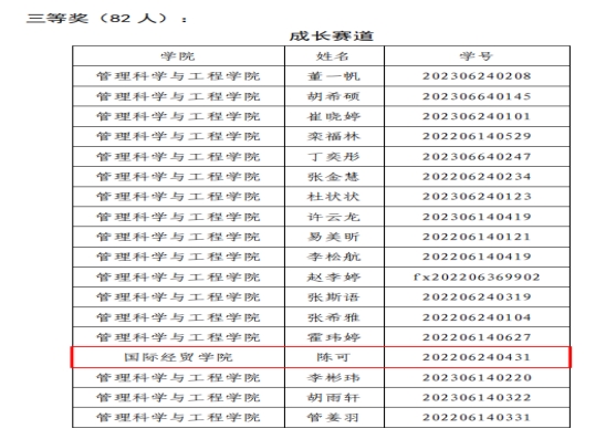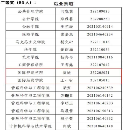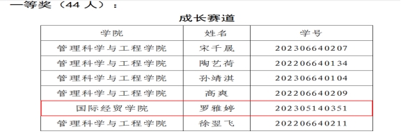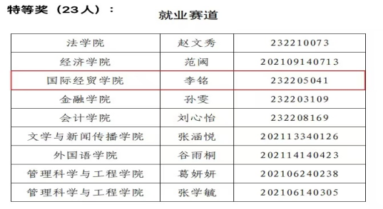 2024年3月,由我校主办的“第一届大学生职业规划大赛”圆满落幕,经过院系推荐、多轮评审等环节,国际经贸学院学子成绩喜人,共有5人获奖:本科生罗雅婷、陈可分别荣获成长赛道一等奖、成长赛道三等奖,研究生李铭荣获就业赛道特等奖,崔迪、王一安荣获就业赛道二等奖。